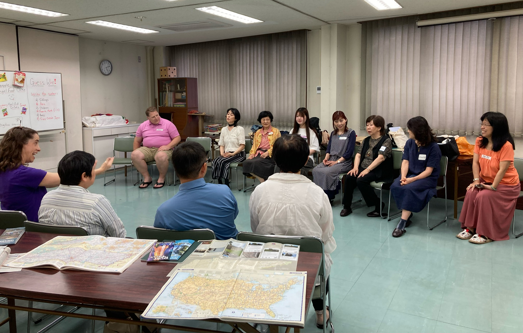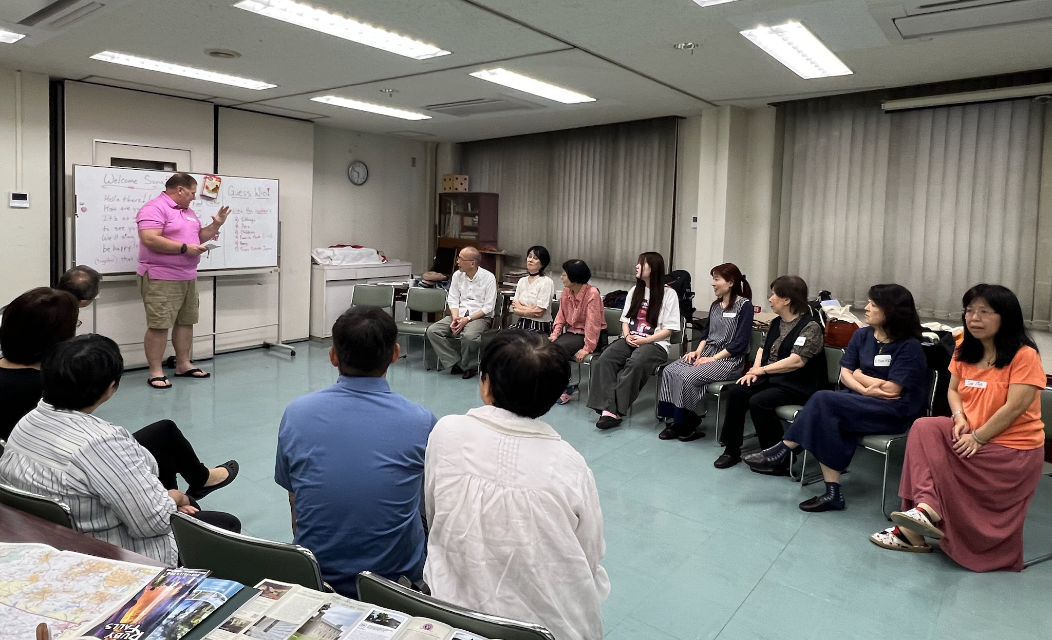 A little later that same evening, we hosted our next ‘Casual Party’ for English readers and church members. We were encouraged by a few more attendees, and everyone really enjoyed themselves! I had some American music going in the background (Dave Brubeck!) to go with grape and strawberry-kiwi Kool-aid. Emily had also prepared a pineapple angel food cake to share, and everyone declared it was ‘Oishii!’ or ‘delicious!’ We played another getting-to-know-you guessing game and gave out a couple of door prizes at the end. It was a sweet time to connect and let the readers get to know a few of the church members a little more.