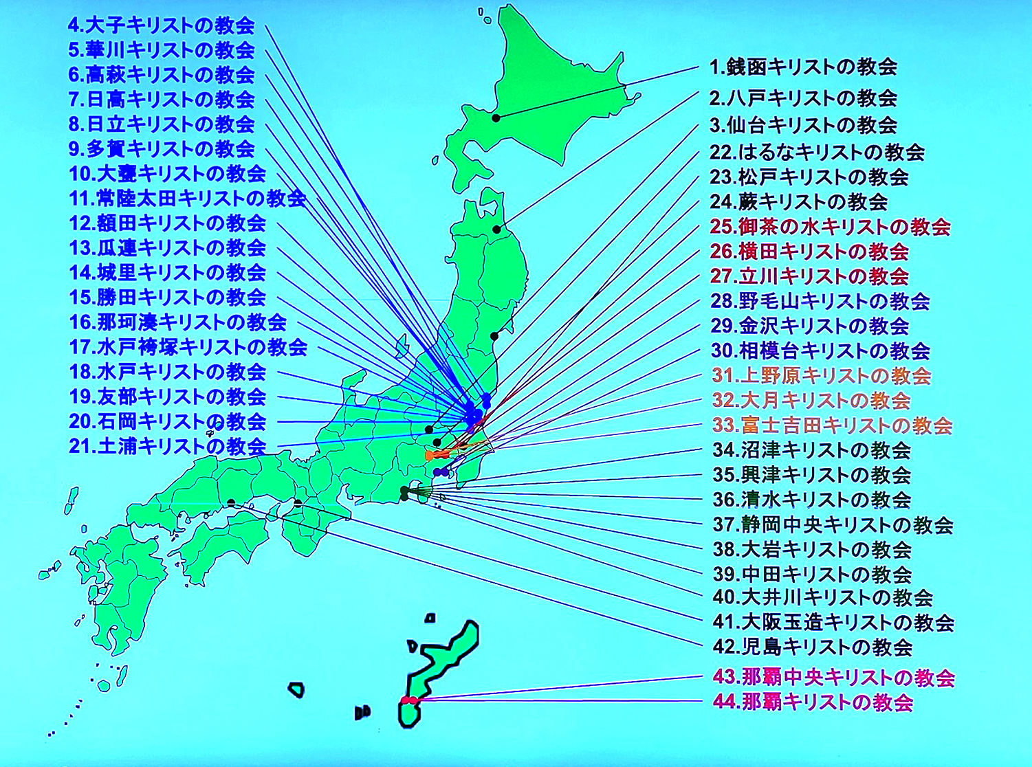 On Monday, Emily and I set out on a two-day excursion. Several people were planning to spend some time with us sharing their insights into Japanese culture and how it affects ministry and missions. They had some history of mission efforts in Japan to share with us as well. We rode the train into downtown Tokyo and headed for the Ochanomizu Church of Christ to meet with Tadayoshi Aikawa and Kazutaka Adachi. They shared some of the history of the churches of Christ, particularly in the Tokyo and Ibaraki areas, as well as some of the challenges reaching and ministering to young adults. The Ibaraki area is where most of the congregations are currently concentrated, and the map above really depicts that well. The ones listed in blue are all in Ibaraki, and the rest are scattered in clusters in a few other places. There is much work still to do!