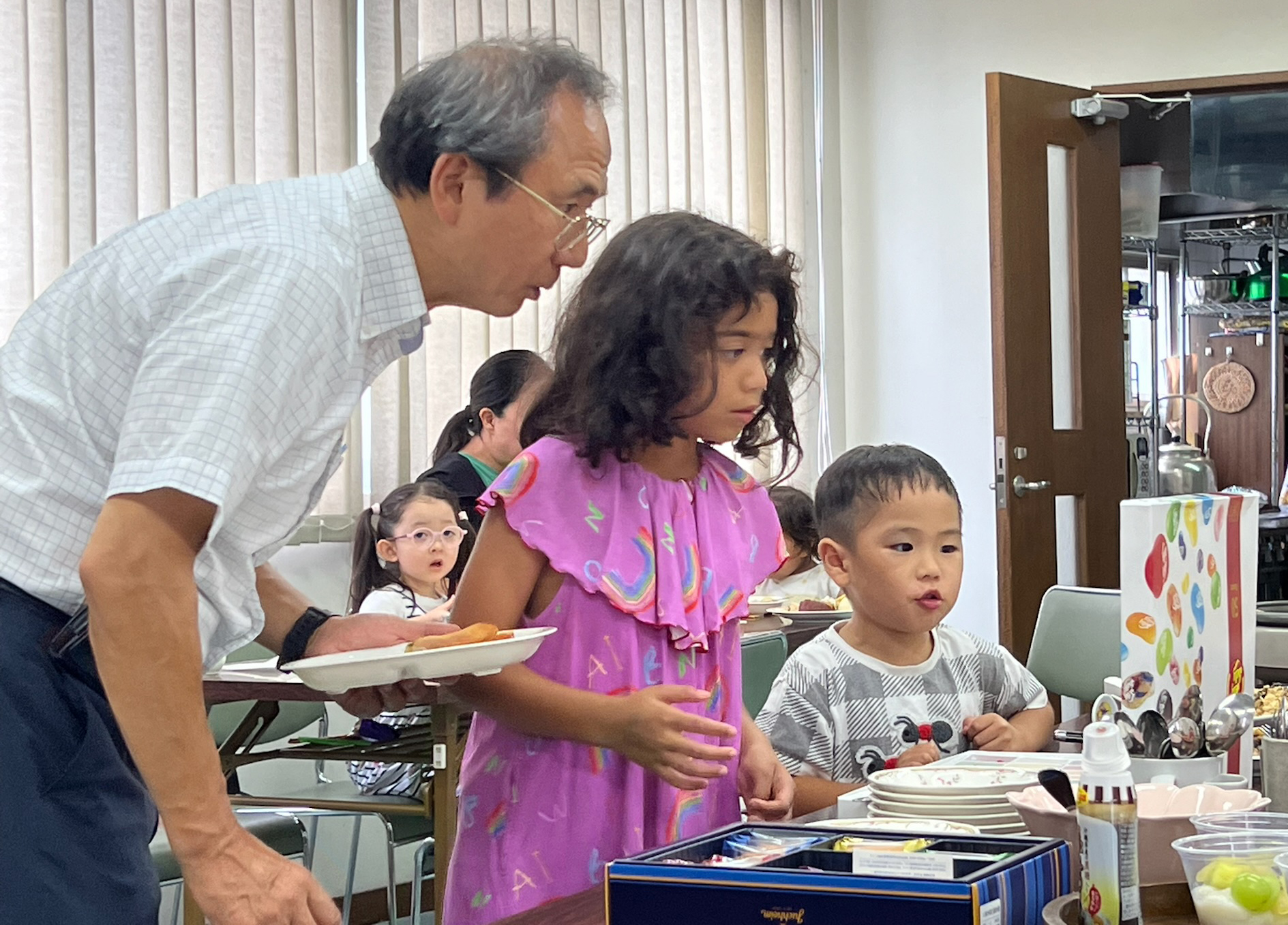 After worship, the congregation held their usual 2nd Sunday potluck meal, but also took the occasion to bid us farewell. These are always such rich times of fellowship, and the food was quite tasty, too! We brought several Jelly Belly 50-Flavor packages on this trip to give as gifts and put our last one out at the meal. It was a hit! Everyone enjoyed sampling the various flavors, and you can see (above left) Nao-san and two of his grandkids thoughtfully picking out their next choices. It was an all-around wonderful final meal together with everyone.